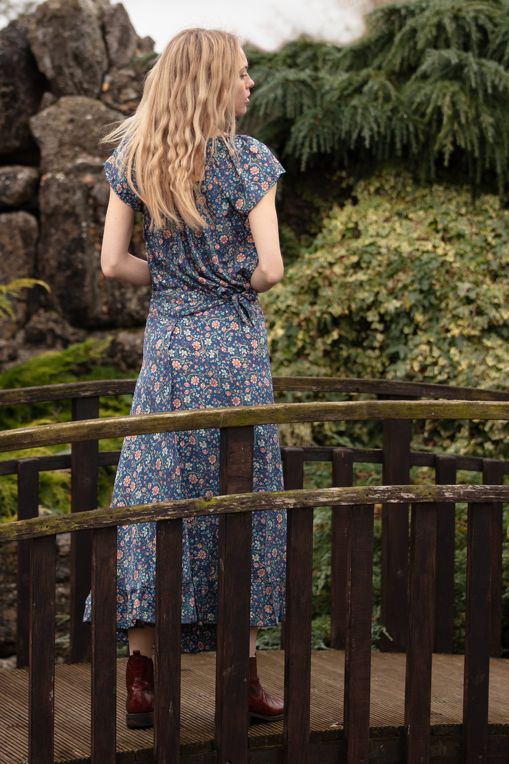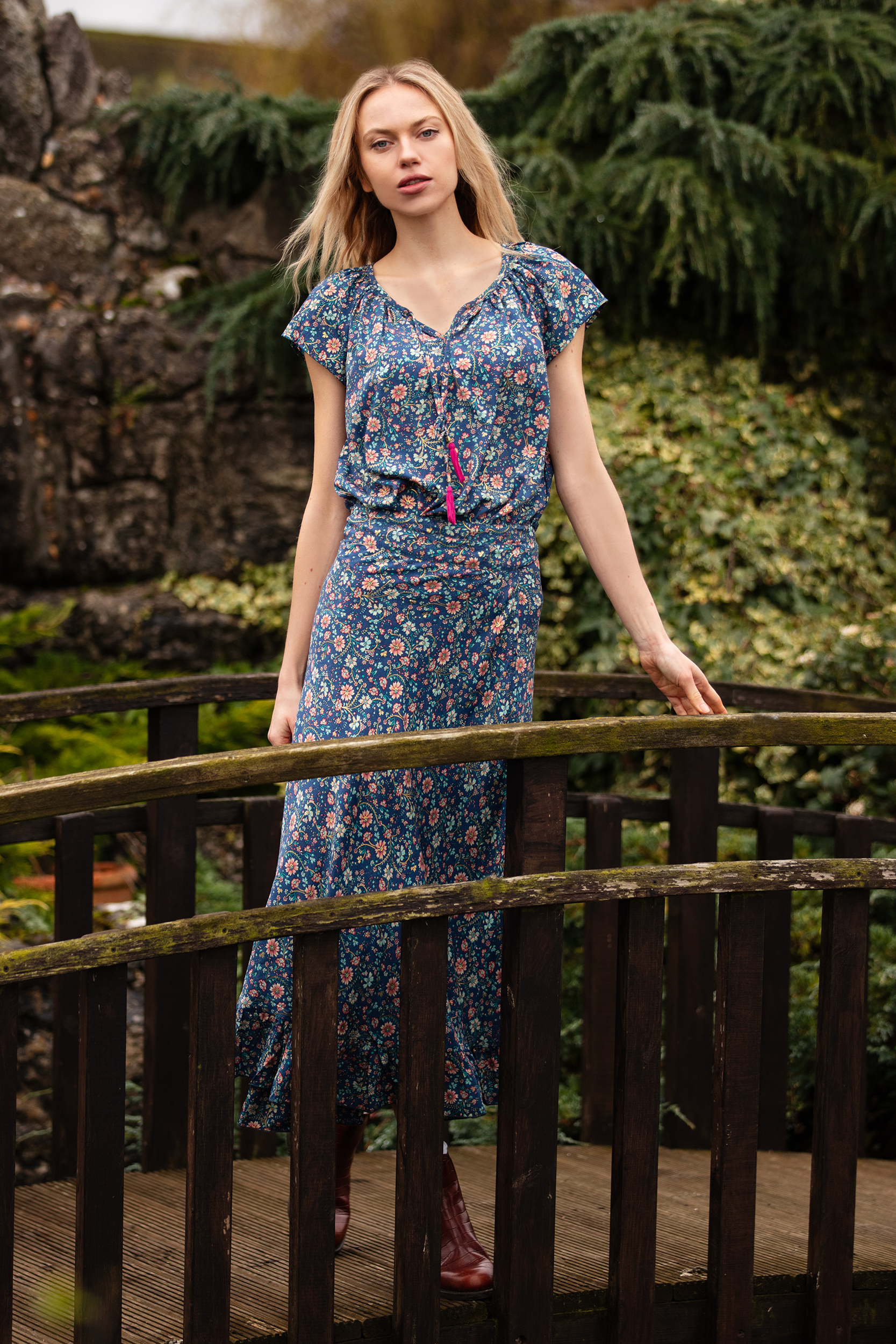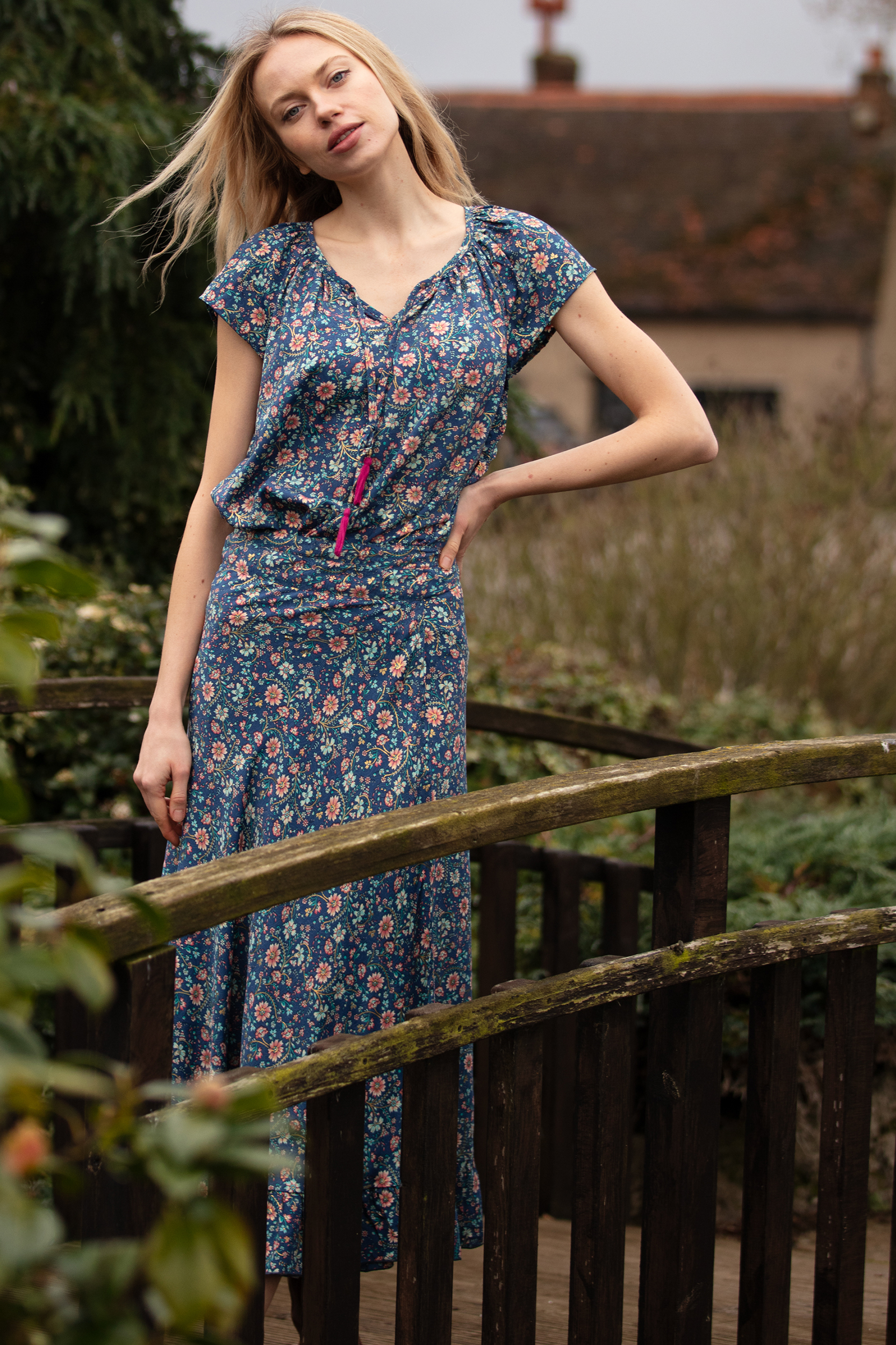 Our popular easy to wear loose-cut blouse has a pretty cap sleeve and ties at the neck with tassel detail. We love the drape and feel of this fabric!