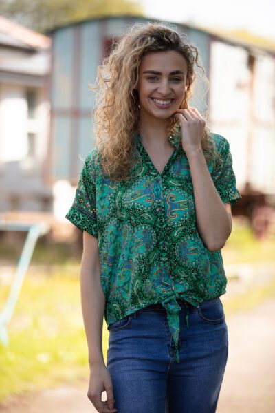 Loose and easy short button blouse. The tie at the bottom can be left open or tied up to make more of a cropped shape. There is no shoulder seam so we could make it in just one loose and drapey size.