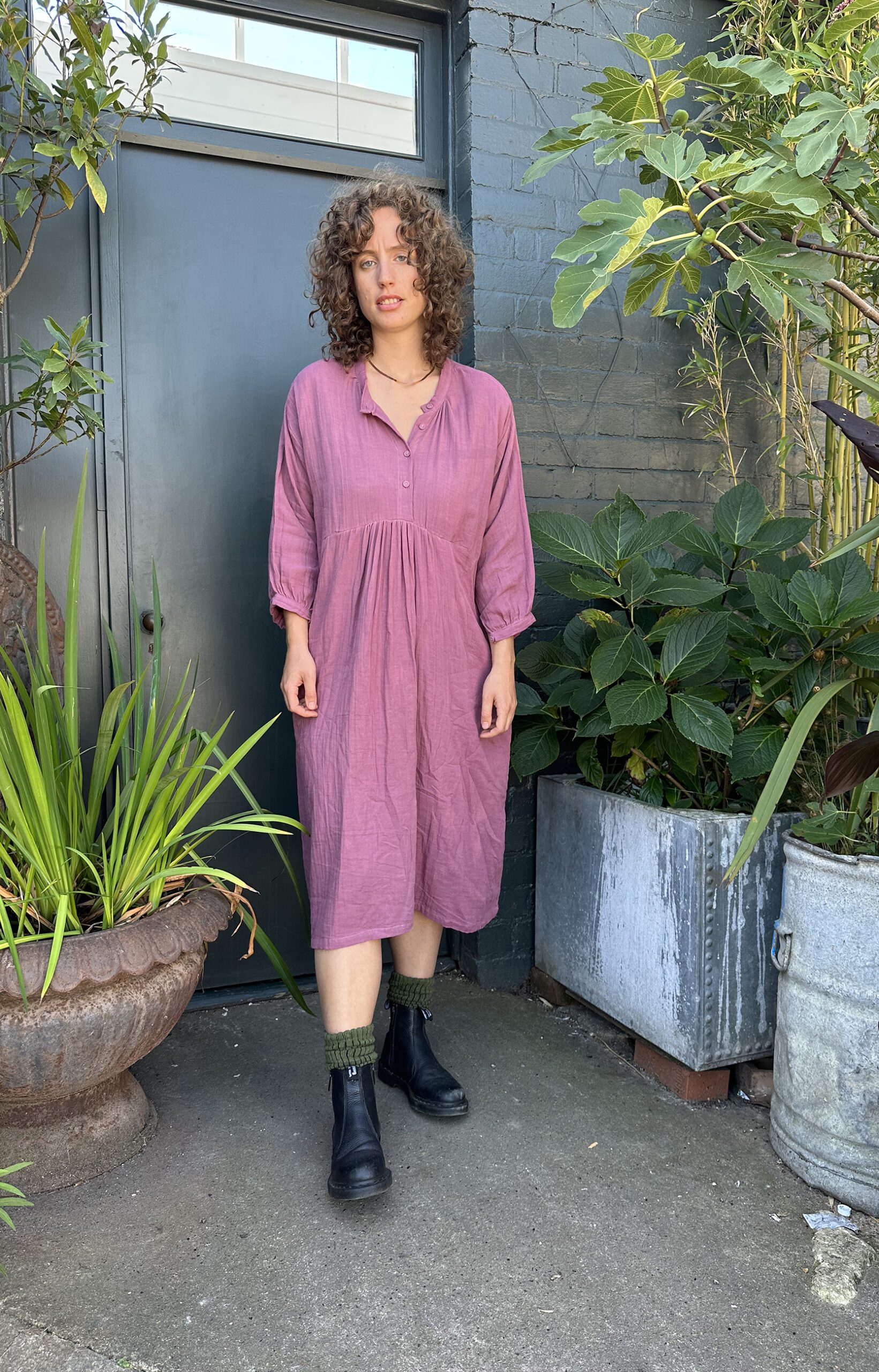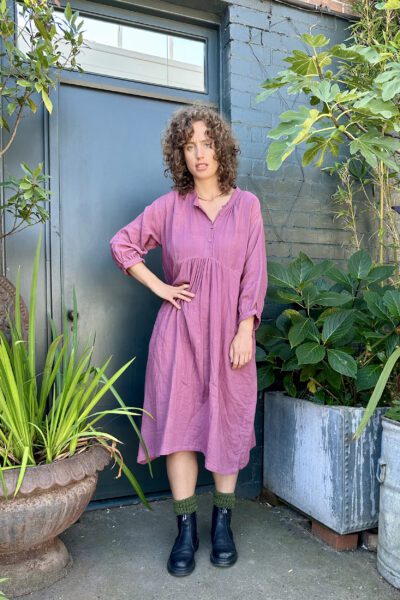 Our new smock dress is made from double-faced cotton, which is really soft against the skin. This dress is super comfy, loosely cut with gathers under the bust with a button front opening. It has three-quarter-length gathered sleeves and 2 deep pockets in the side seams. It also looks great worn over jeans or loose trousers.