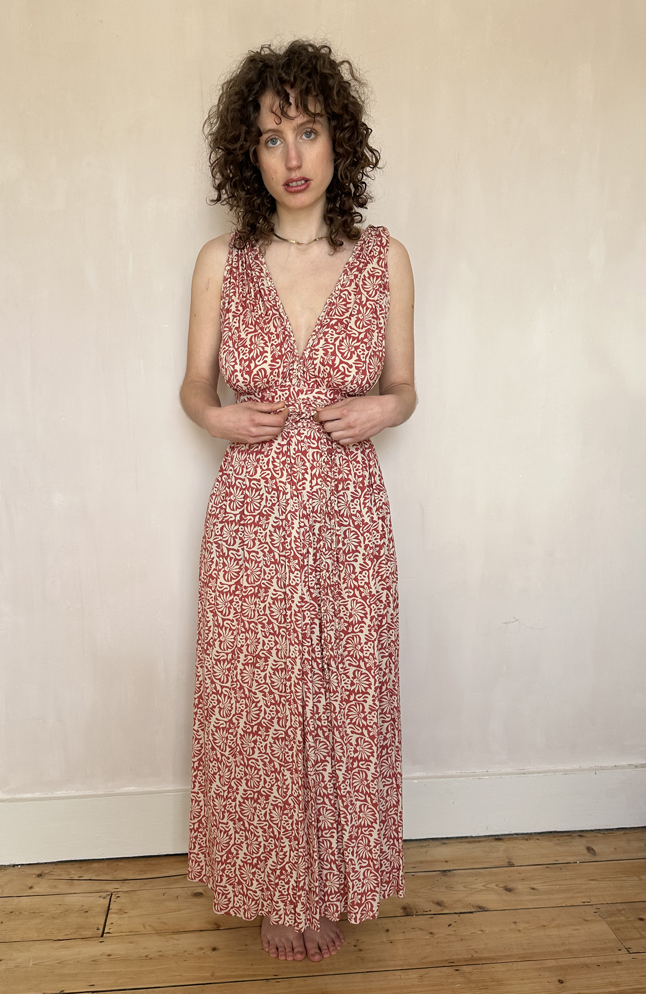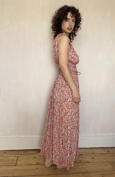 Our beautiful new summer dress has a deep V-neck and a V-shaped back. The waist has elastic smocking at the back with gathering at the bust making it very versatile size-wise. There are small loops of fabric at the shoulder to give further adjustment. The top part has a plaited border detail front and back and the dress comes with a long plaited fabric belt that you can wind around the waist area to pull it in. The skirt part has two side splits reaching to just above the knee. Made from our new soft and fluid modal which is 100% natural.