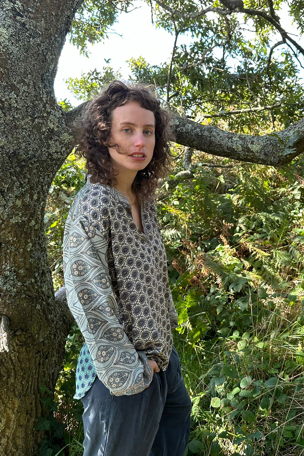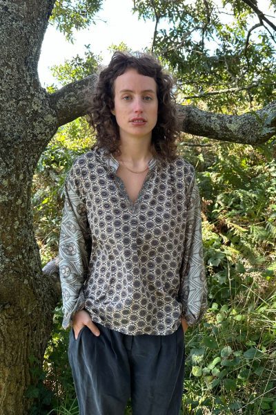 Relaxed loosely cut boho style top with an open neck and wide sleeves with an elasticated wrist. The hem is curved gently at the bottom.