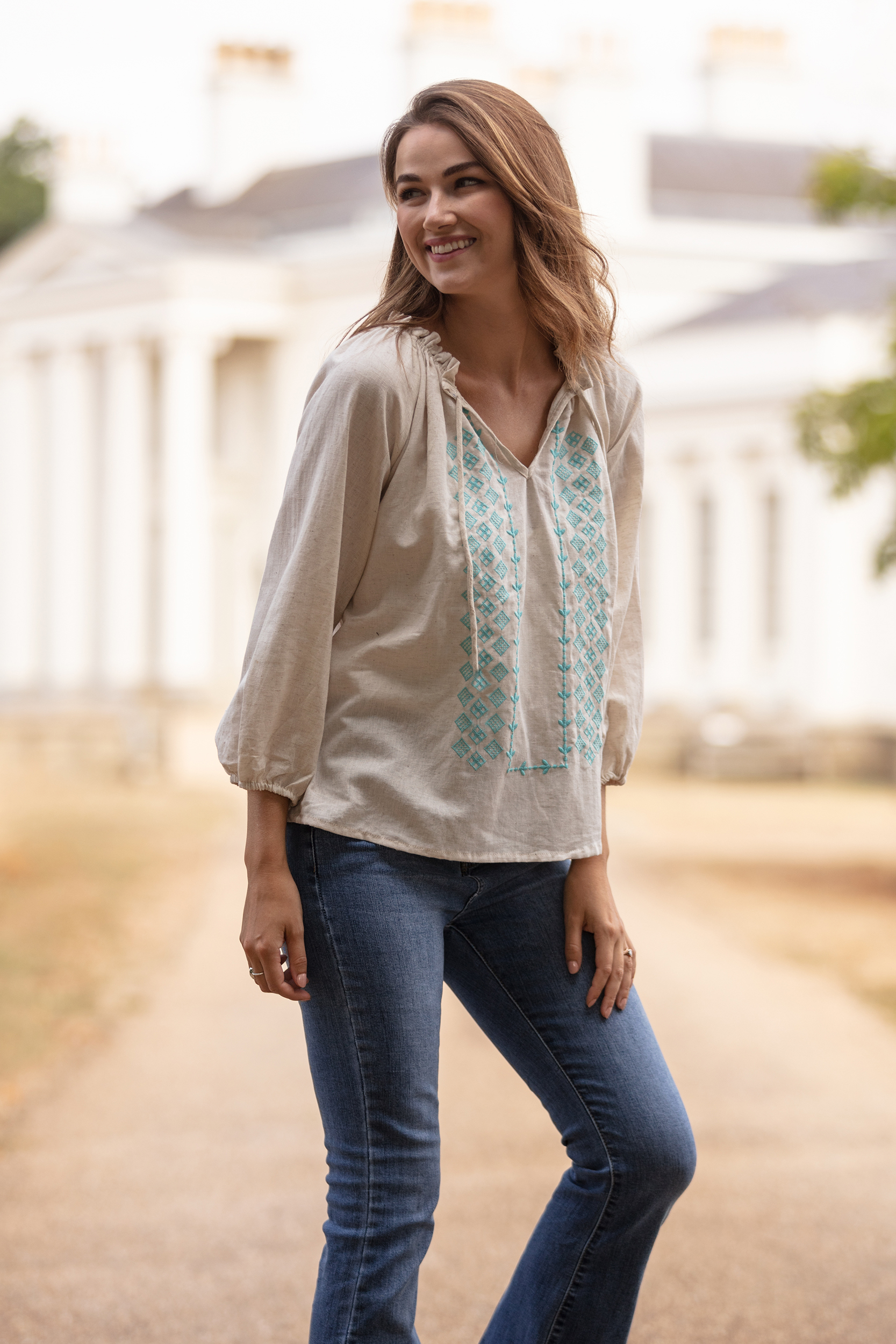 A loosely cut, long-sleeve top made from unbleached Indian cotton. It has embroidery at the front and a cotton tie at the neck. Length 56cm. Size S/M(8-12) and M/L(12-16). 100% Cotton. Machine wash at 30 degrees.