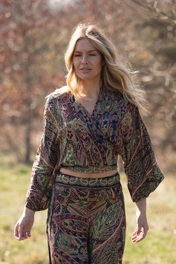 This stunning new fabric is a viscose modal blend, a natural fibre made from the stem of the cotton plant. It has the same vibrant colours and gold flecks as our other fabrics but is even more soft and fluid, as well as being breathable and natural. We love it!