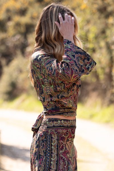 This crossover tie top has been cut generously with long ties that can be draped, wrapped and tied in a multitude of ways. It has long loose sleeves. One size fits 8 to 20 depending on how you wear it!