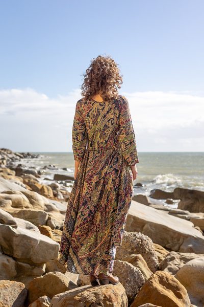This stunning new fabric is a viscose modal blend, a natural fibre made from the stem of the cotton plant. It has the same vibrant colours and gold flecks as our other fabrics but is even more soft and fluid, as well as being breathable and natural. We love it!