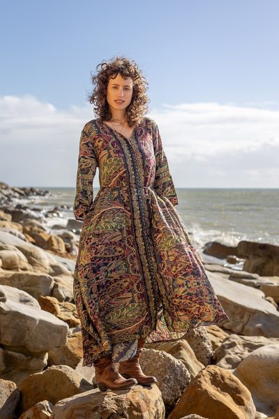 Our new season shirt dress has a v-neck and buttons all the way down the front. The skirt part of the dress is gently flared with pockets in the side seams and is slightly longer at the back. It has an optional belt and mid-length sleeves with elastic at the cuff. This versatile style can be worn as a dress, or left open as a duster-style jacket.