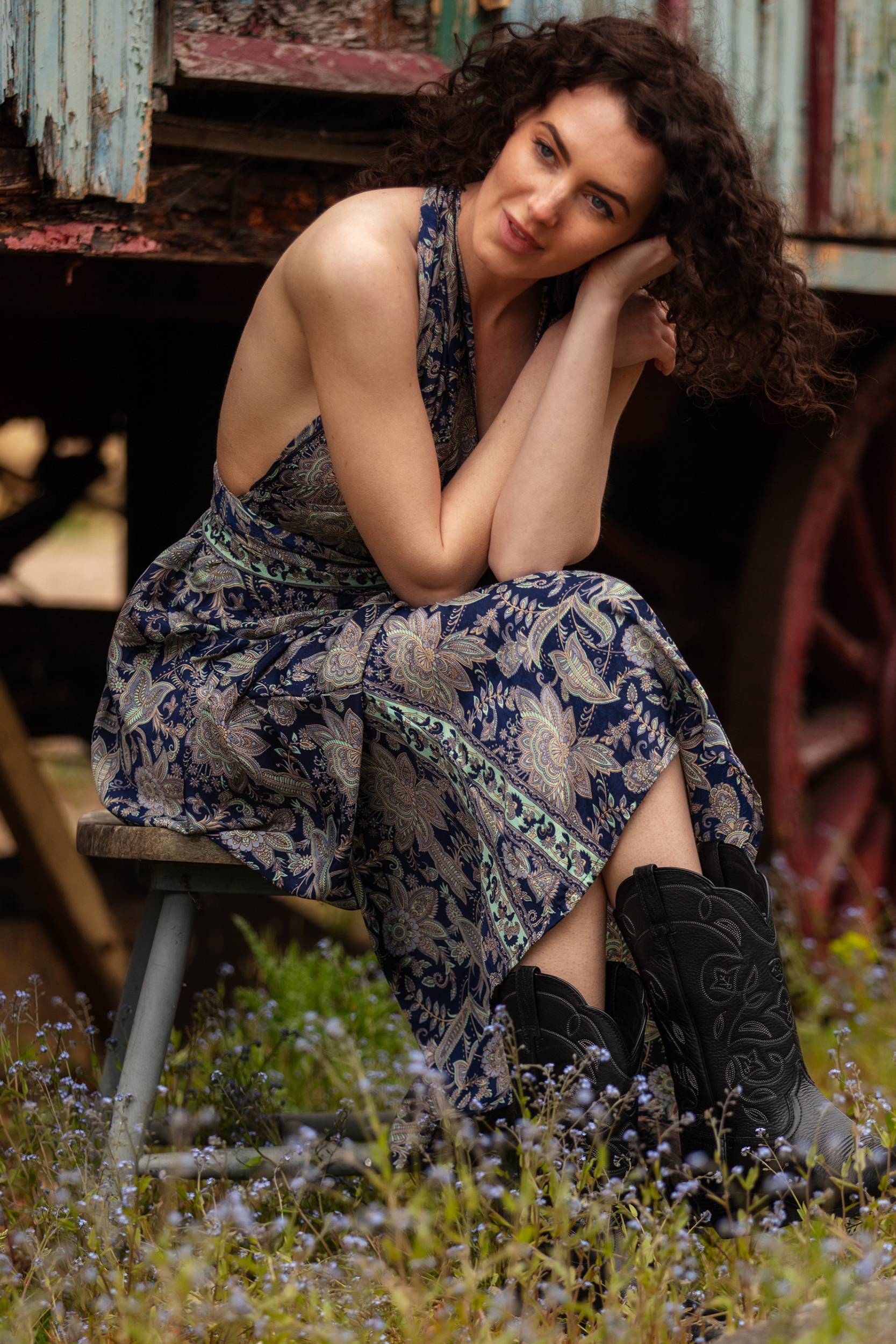 This incredibly versatile dress has a loose maxi skirt part fitted with elastic smocking at the back of the waist. The top part of the dress is made of a wide and long halter section that can be wrapped and tied in a multitude of ways. We’ve captured a few of them here, scroll over (or magnify) the dress images to see the magic!