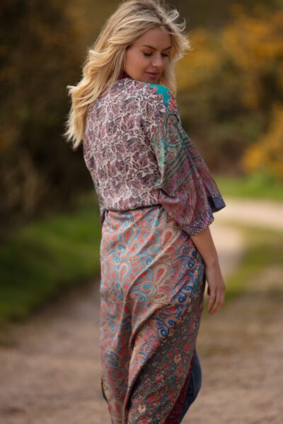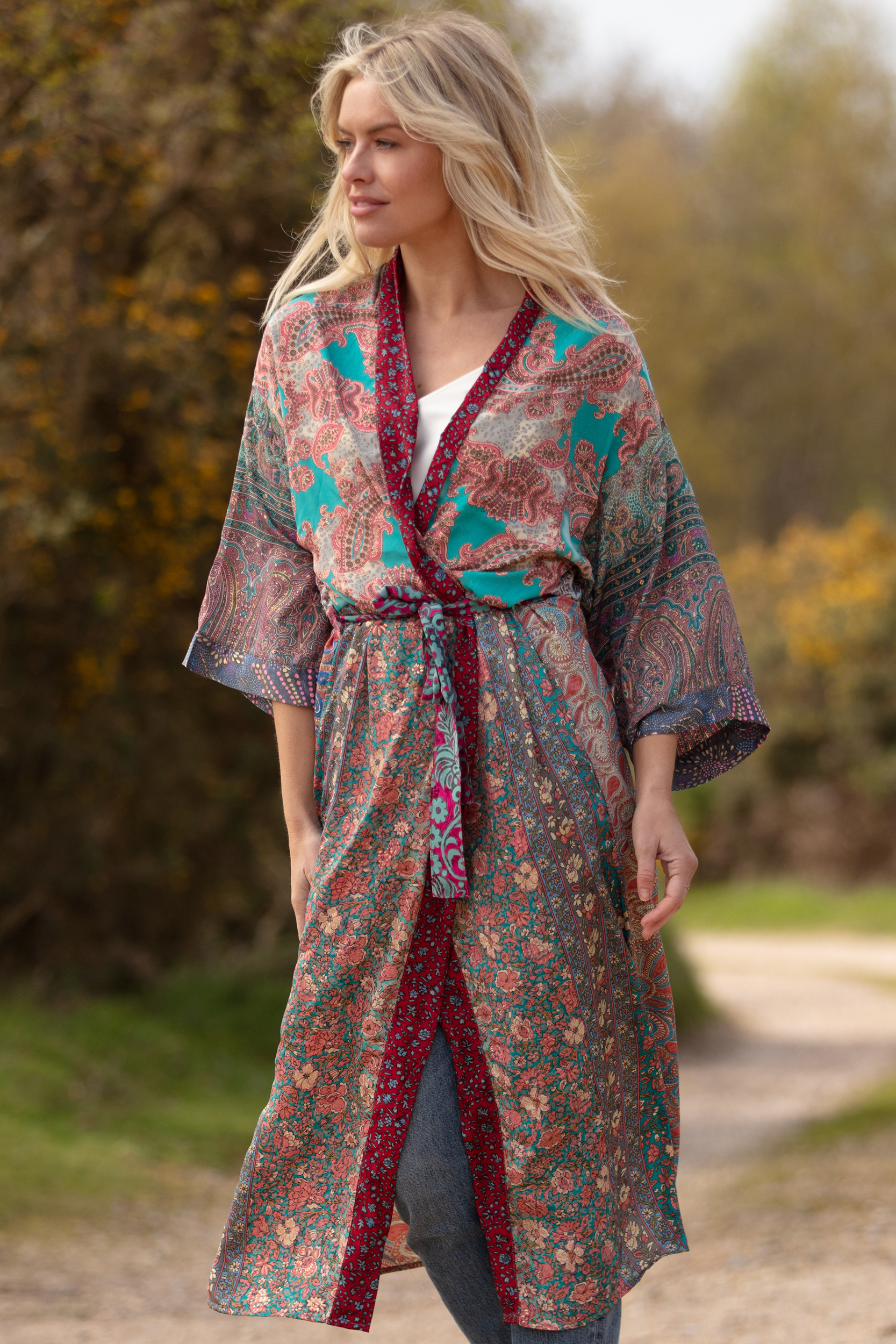 Fabulous long-length patchwork kimono in assorted mixed colours. We make these from leftover patches of fabric from the factory we work with in Rajasthan. They are fantastic to throw on over jeans or something else, for instant glamour and can be worn open or closed. They make great beach cover-ups and can be used as a dressing gown (although the wrap is much smaller than on our loungewear kimonos). This kimono has slits at the side and a belt.
