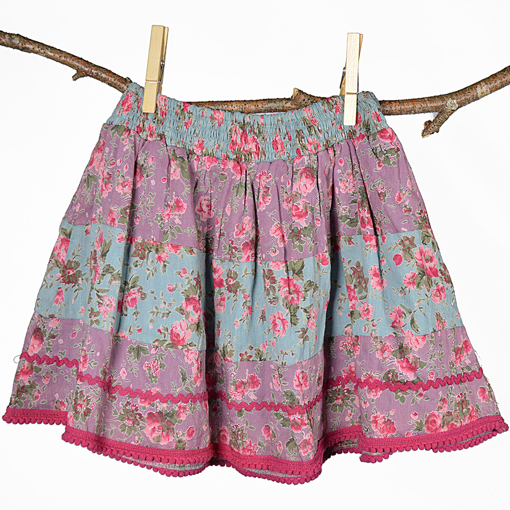 Delightful vintage-inspired tiered skirt with rik-rak detail. The skirt has a stretchy elastic waist and little pom-poms along the hem. 100% cotton. Fully lined. Machine wash at 40 degrees. 100% Cotton, machine wash at 40 degrees.