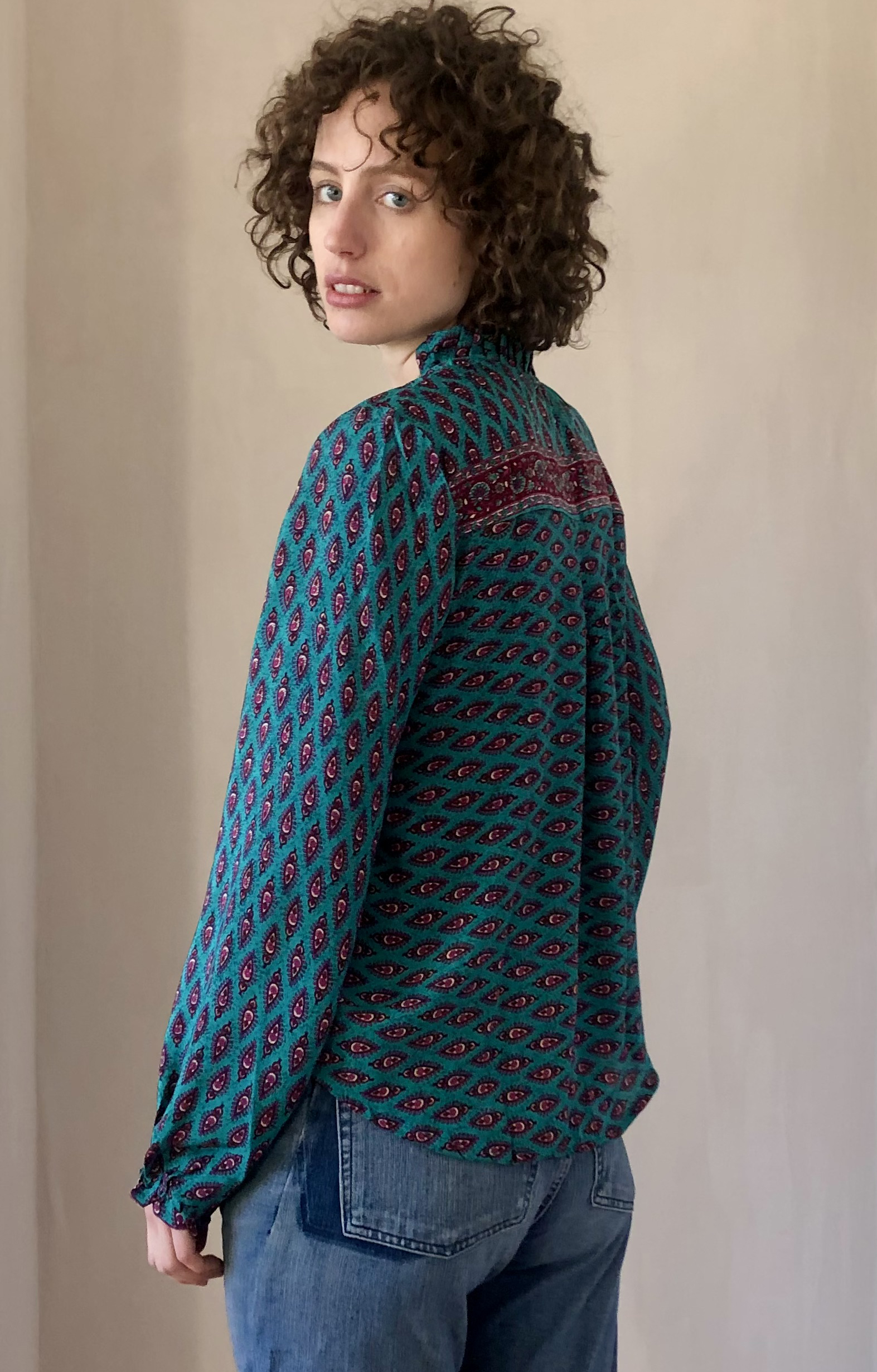 An elegant buttoned v-neck blouse with a small ruffle at the neck and down the front and long sleeves gathered at the wrist.